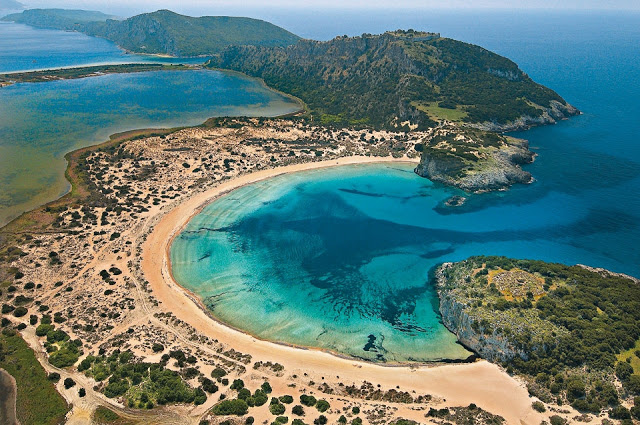 The beach is called Voidokilia (meaning “cow’s belly”), a sweeping semicircle of light golden sand on the Ionian coast. Surrounded by towering limestone cliffs, it’s said to be one of the most beautiful in the world.